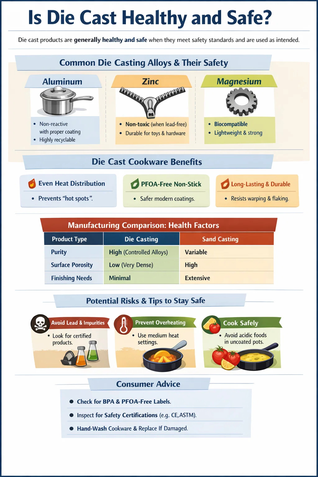Sääntelemättömillä markkinoilla metalliromua voidaan käyttää painevalu prosessi. Tämä voi lisätä lyijyä, kadmiumia tai arseenia. Pysyäksesi terveenä osta aina painevalettu tuotteita, joilla on sertifikaatit, kuten FDA:n hyväksyntä ruokakosketukseen tai RoHS-yhteensopivuus elektroniikkaan ja leluihin.