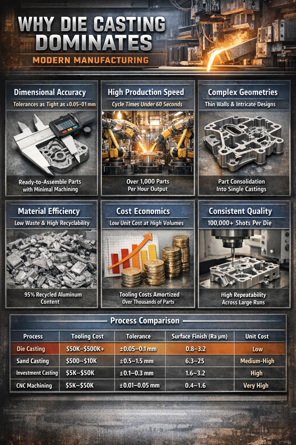 | Die Casting | Korkea (50 000–500 000 dollaria) | Matala | ±0,05–0,1 mm | 0,8–3,2 |