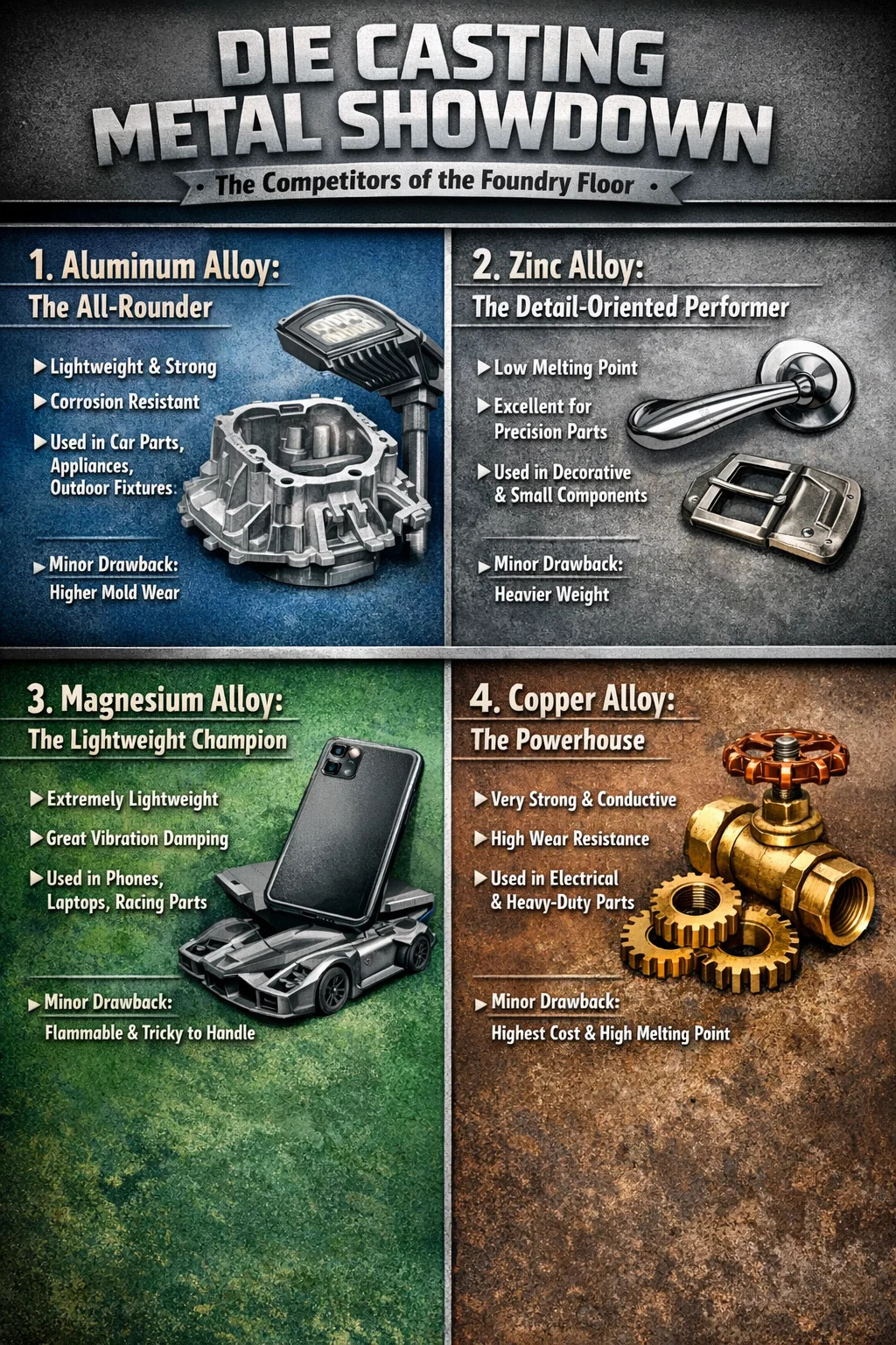 ▪Pieni haittapuoli: Kuparilla on erittäin korkea sulamispiste, mikä asettaa merkittäviä haasteita painevalukoneille ja muoteille, mikä johtaa korkeimpiin kustannuksiin.